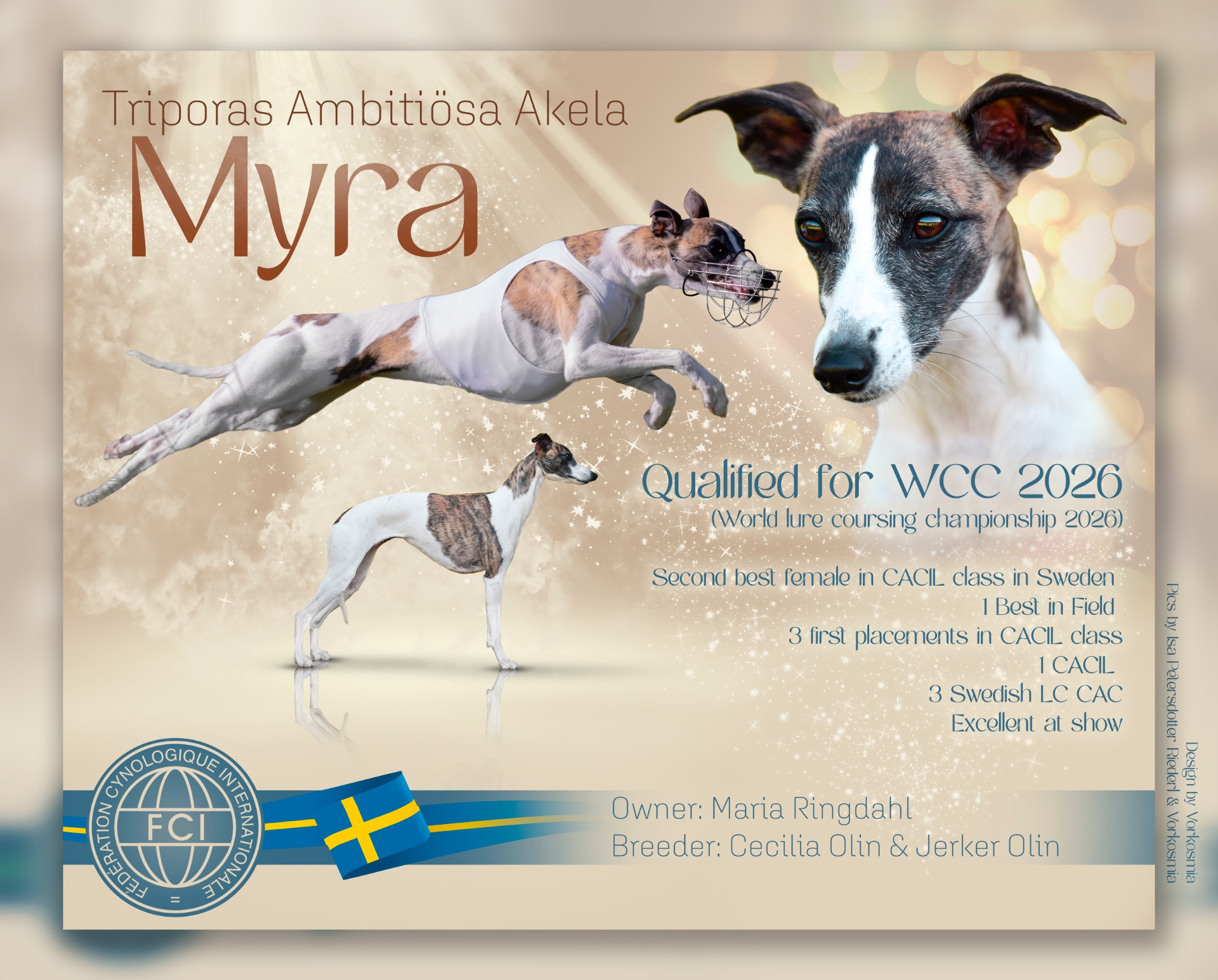 Triporas Ambitiösa Akela ”Myra” är inbjuden till VM i Lure coursing 2026!